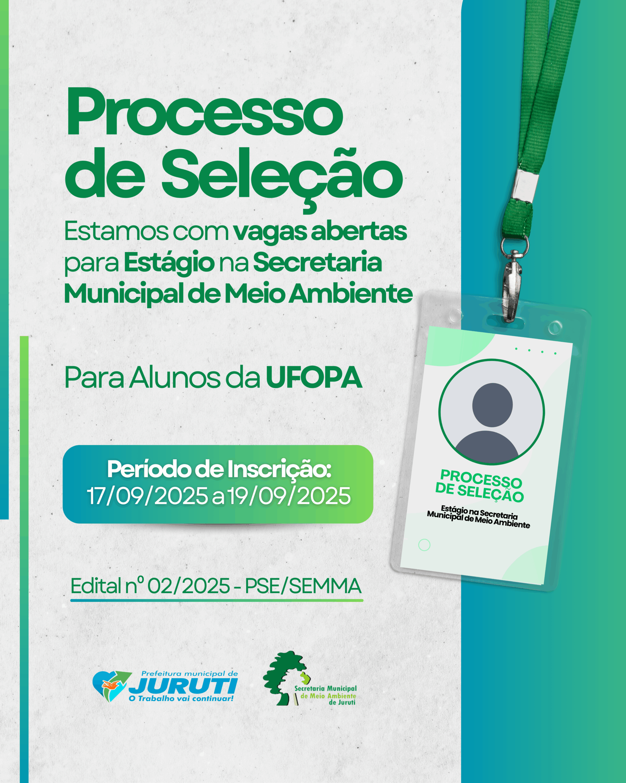 A Prefeitura Municipal de Juruti, por meio da Secretaria Municipal de Meio Ambiente (SEMMA) informa que estão abertas as inscrições para o Processo Seletivo de Estágio Obrigatório destinado aos alunos da Universidade Federal do Oeste do Pará – UFOPA, Campus de Juruti