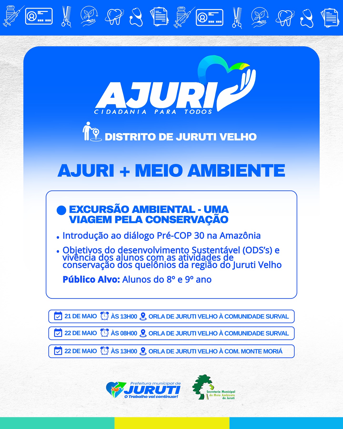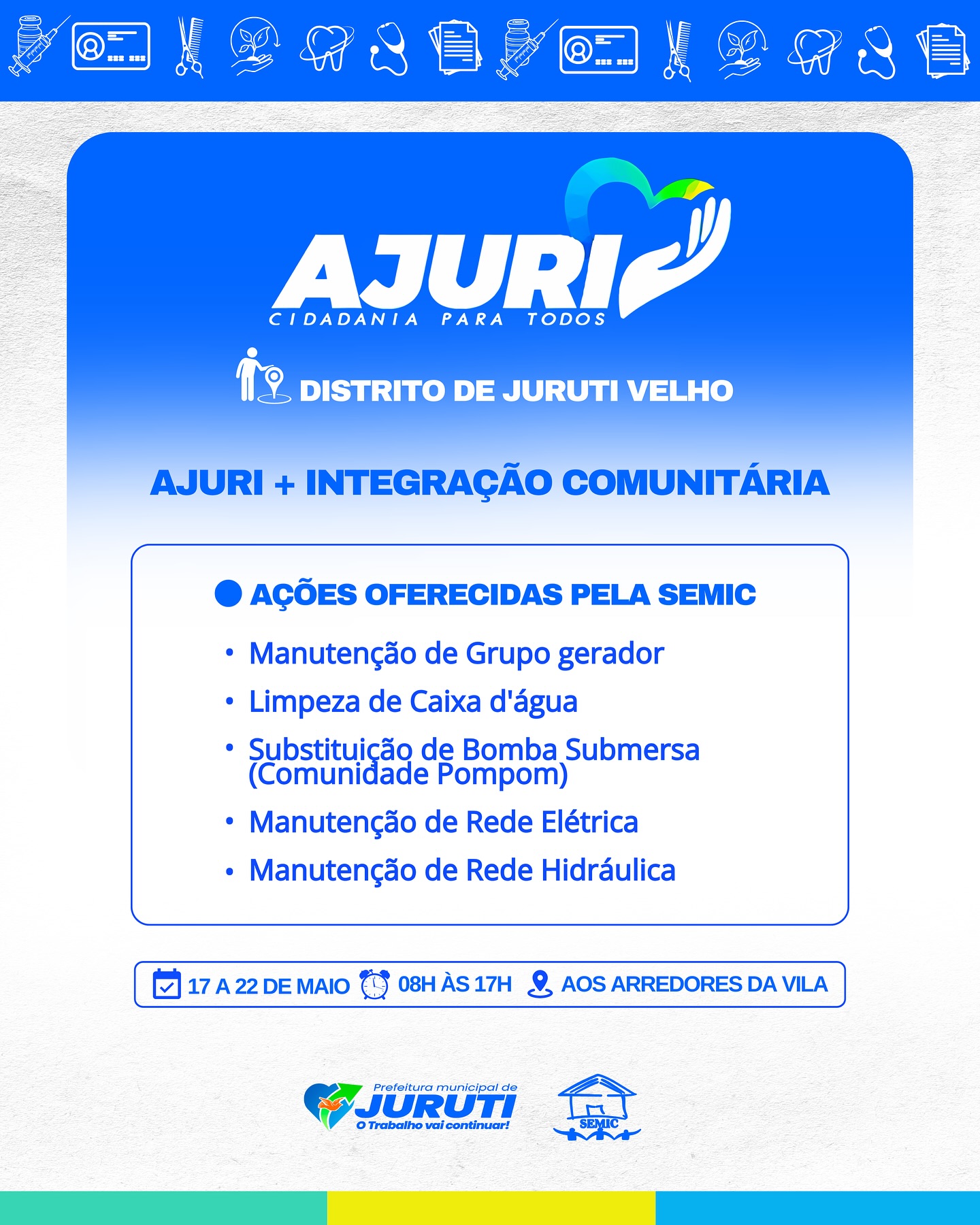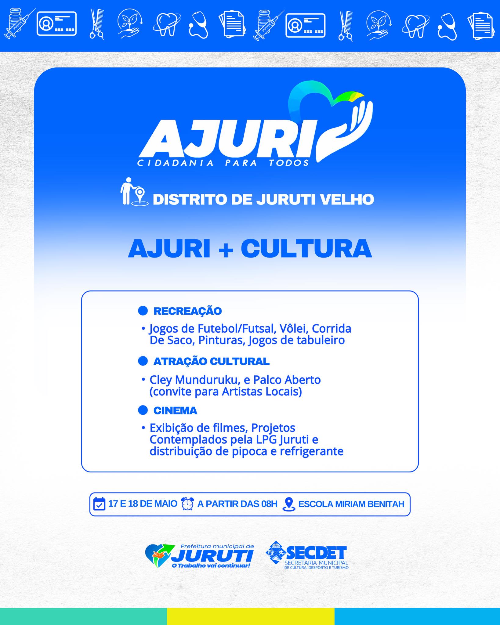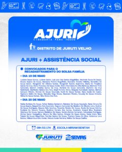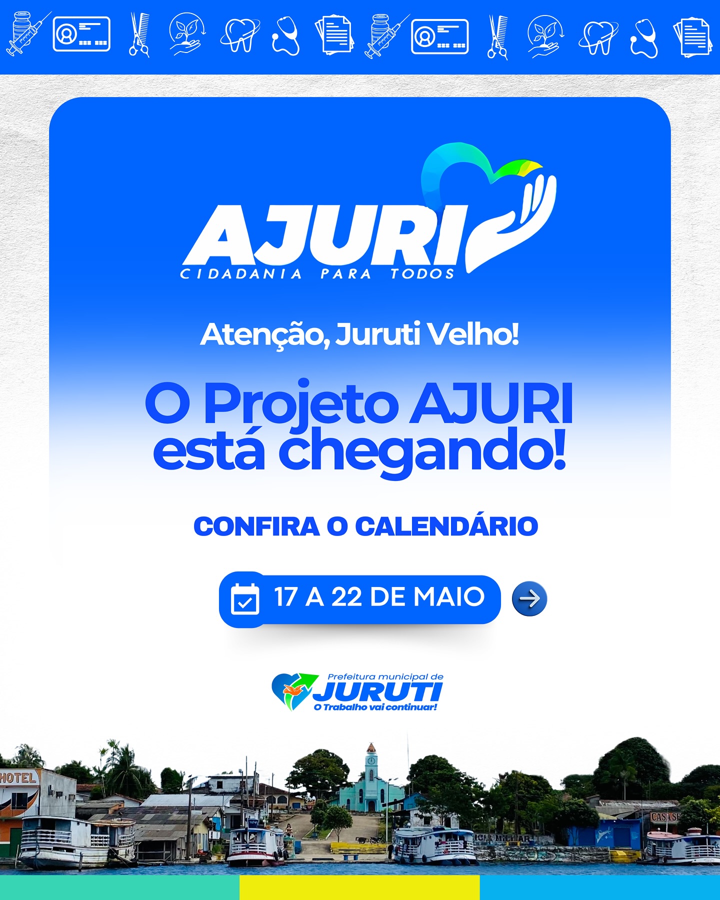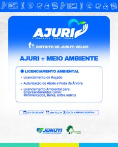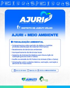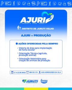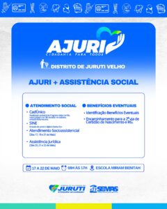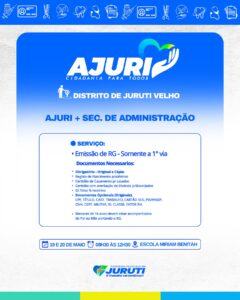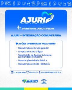 De 17 a 22 de maio, a Prefeitura de Juruti realiza no Distrito de Juruti Velho mais uma edição do Projeto Ajuri, uma grande mobilização que leva cidadania, cuidado e serviços essenciais para mais perto da população.