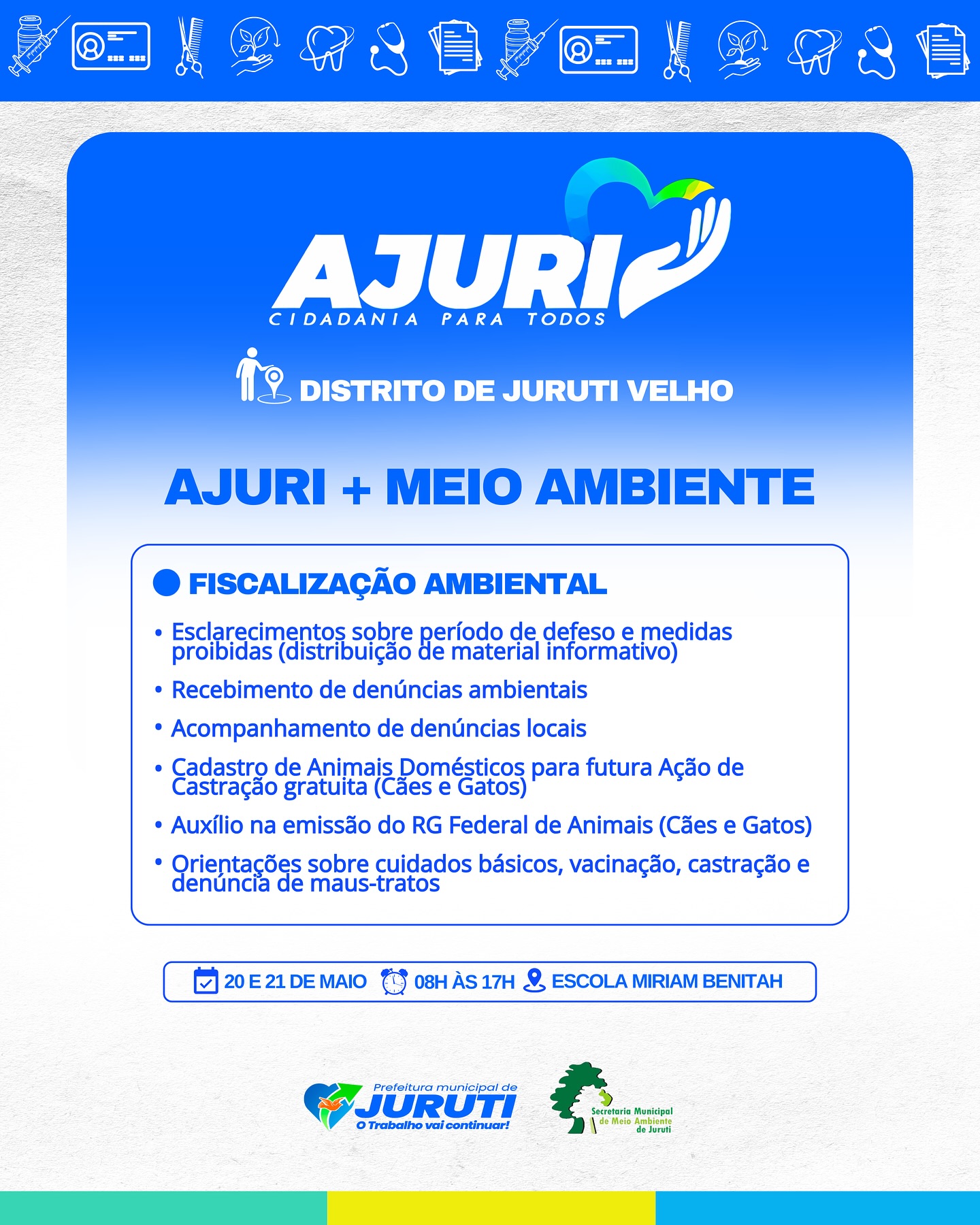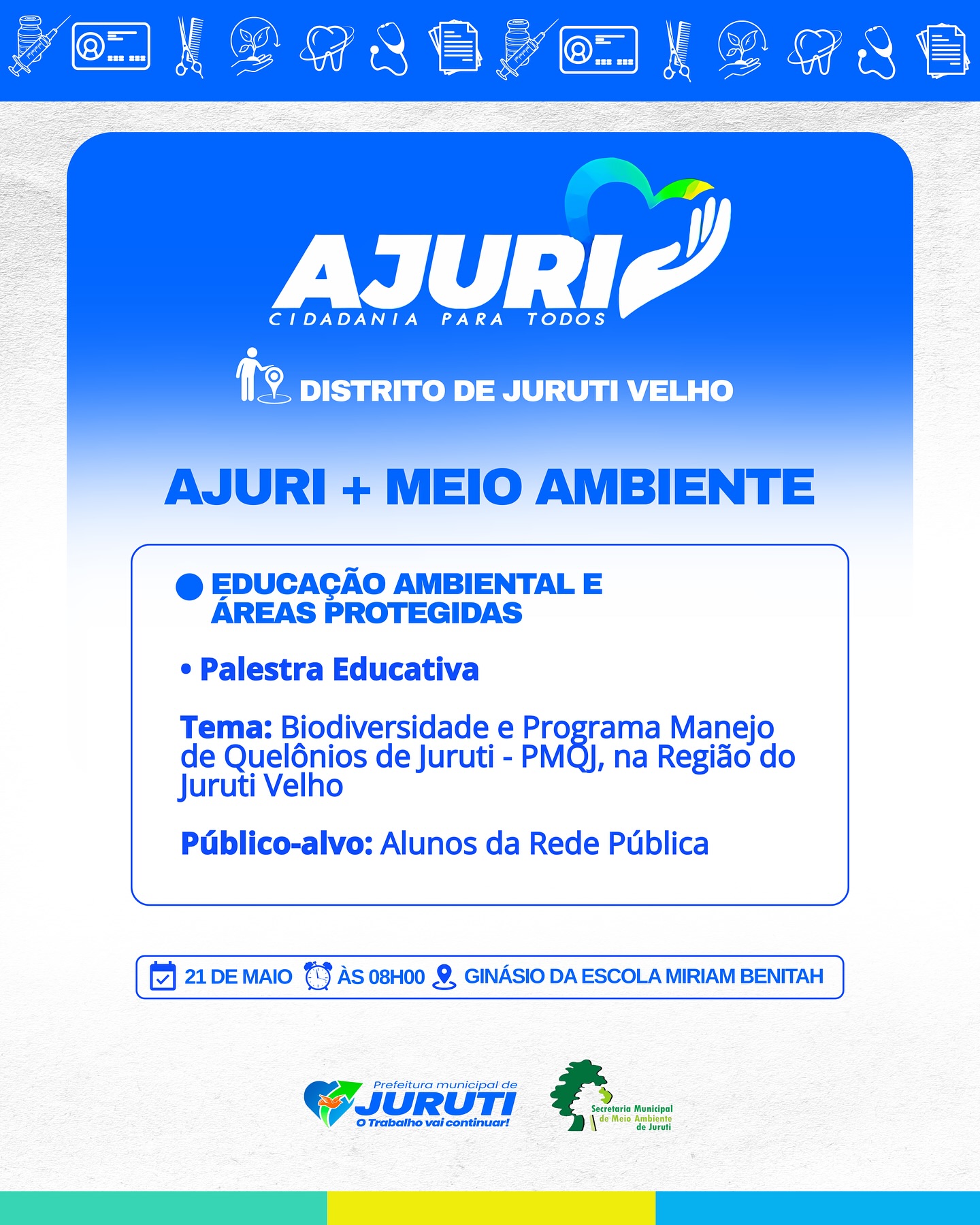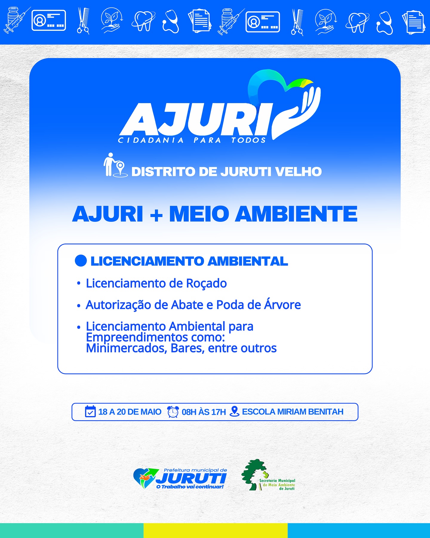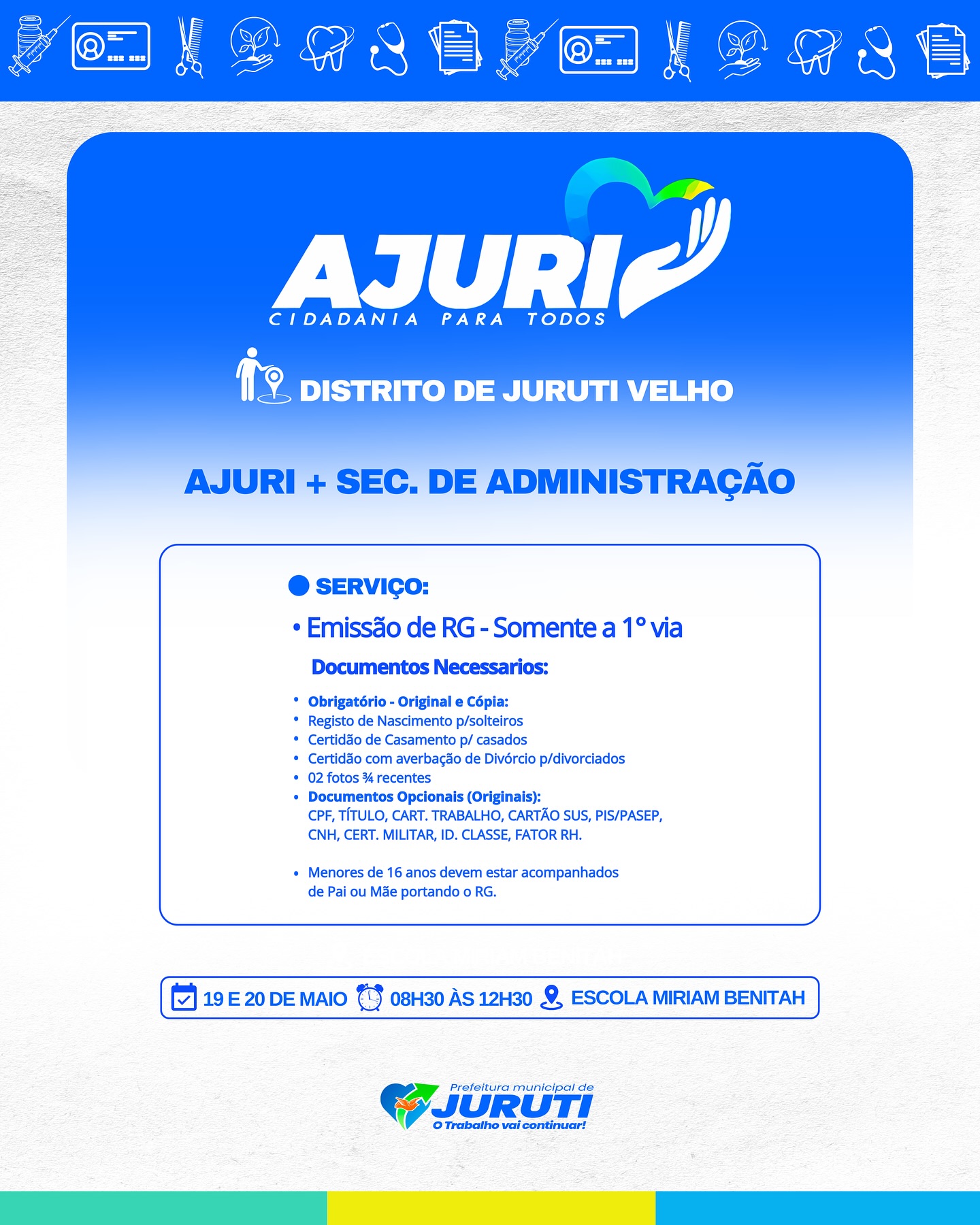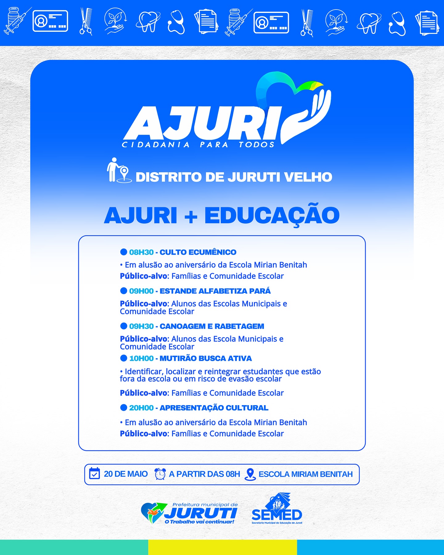 De 17 a 22 de maio, a Prefeitura de Juruti realiza no Distrito de Juruti Velho mais uma edição do Projeto Ajuri, uma grande mobilização que leva cidadania, cuidado e serviços essenciais para mais perto da população.