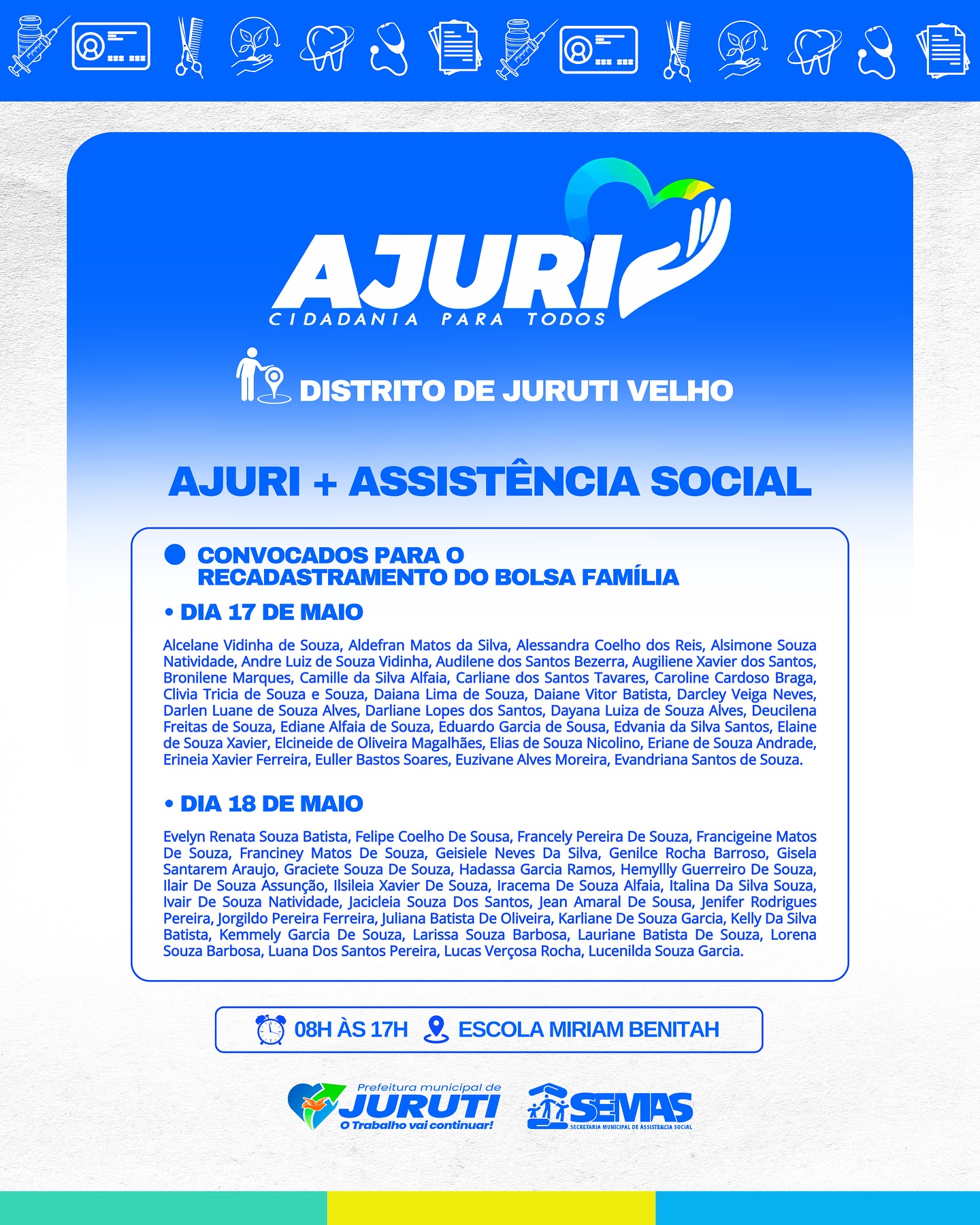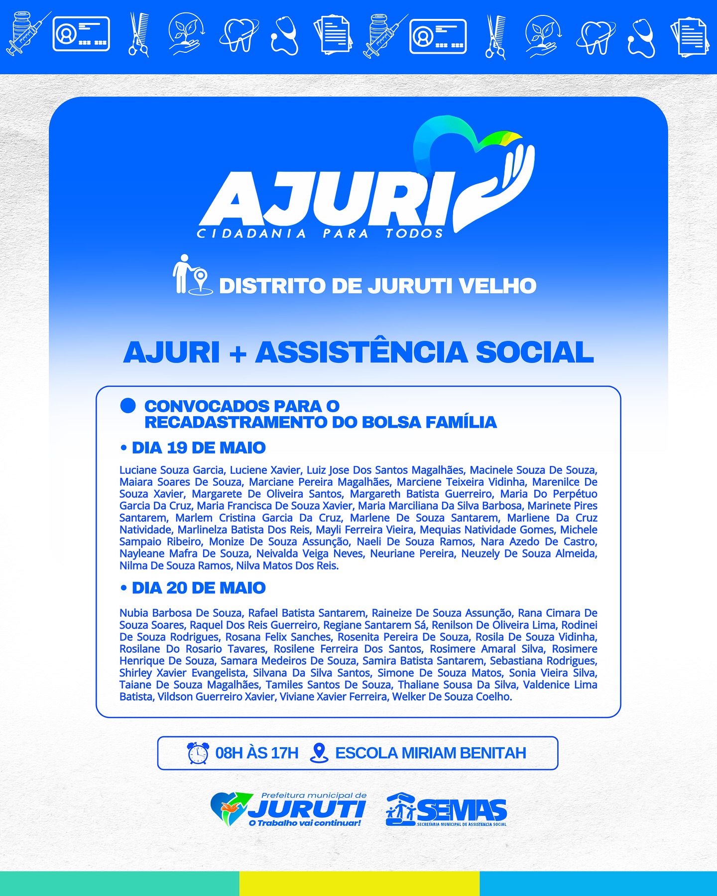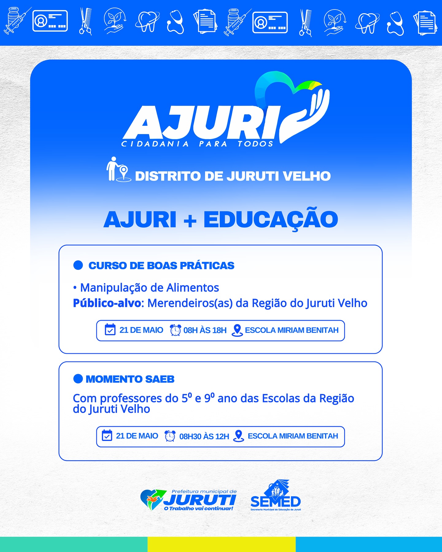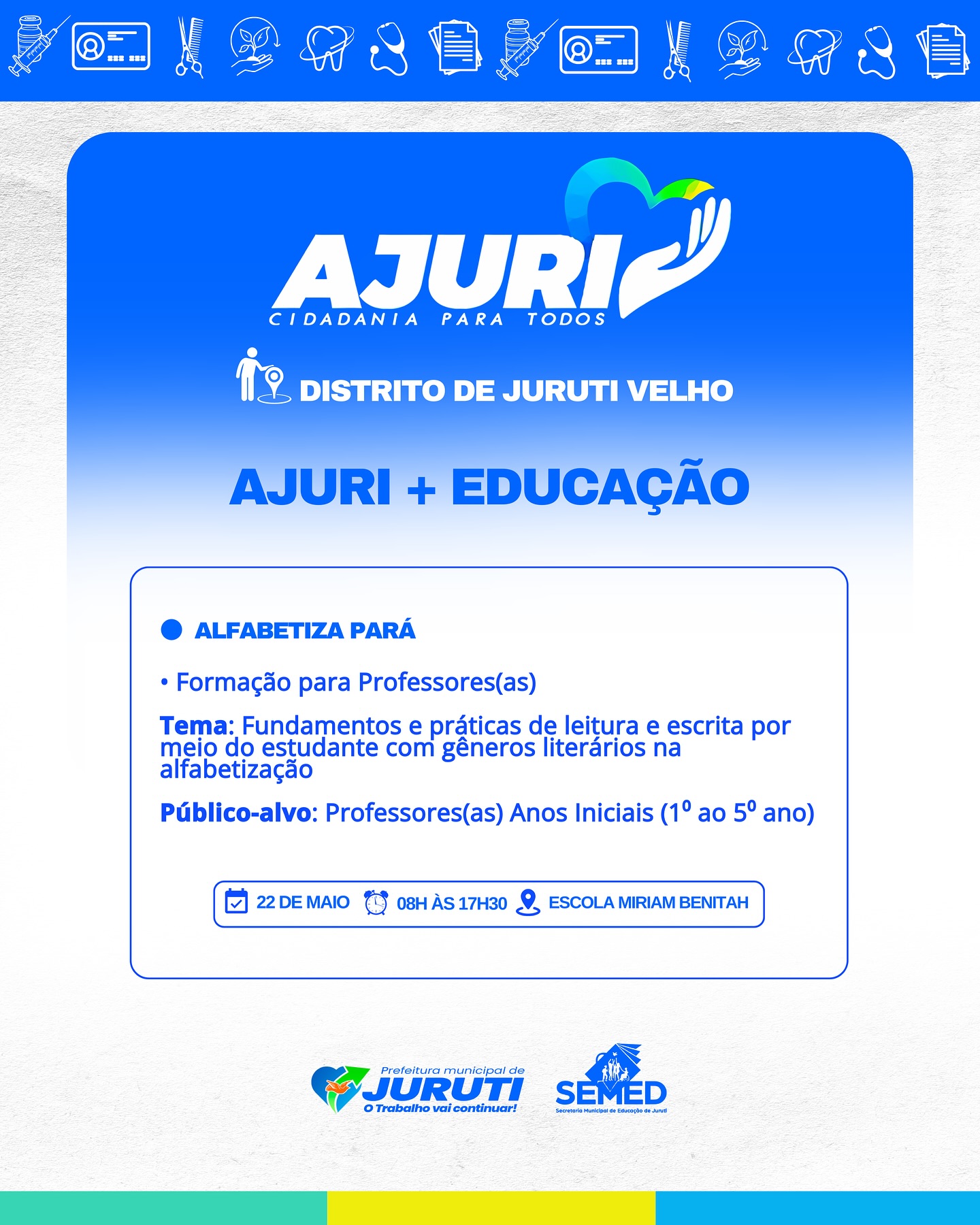 De 17 a 22 de maio, a Prefeitura de Juruti realiza no Distrito de Juruti Velho mais uma edição do Projeto Ajuri, uma grande mobilização que leva cidadania, cuidado e serviços essenciais para mais perto da população.