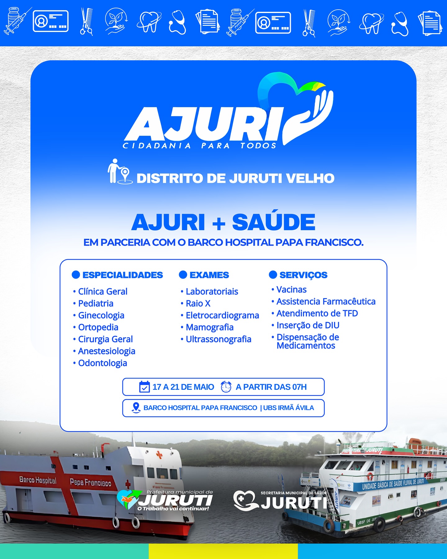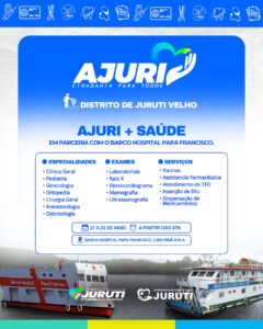 Durante seis dias, a população contará com uma ampla oferta de atendimentos e atividades, realizados em pontos estratégicos como a Orla de Juruti Velho, a Escola Miriam Benitah, a UBS Irmã Ávila e também no Barco Hospital Papa Francisco, nosso parceiro nessa missão, que estará ancorado oferecendo atendimentos de saúde especializados.