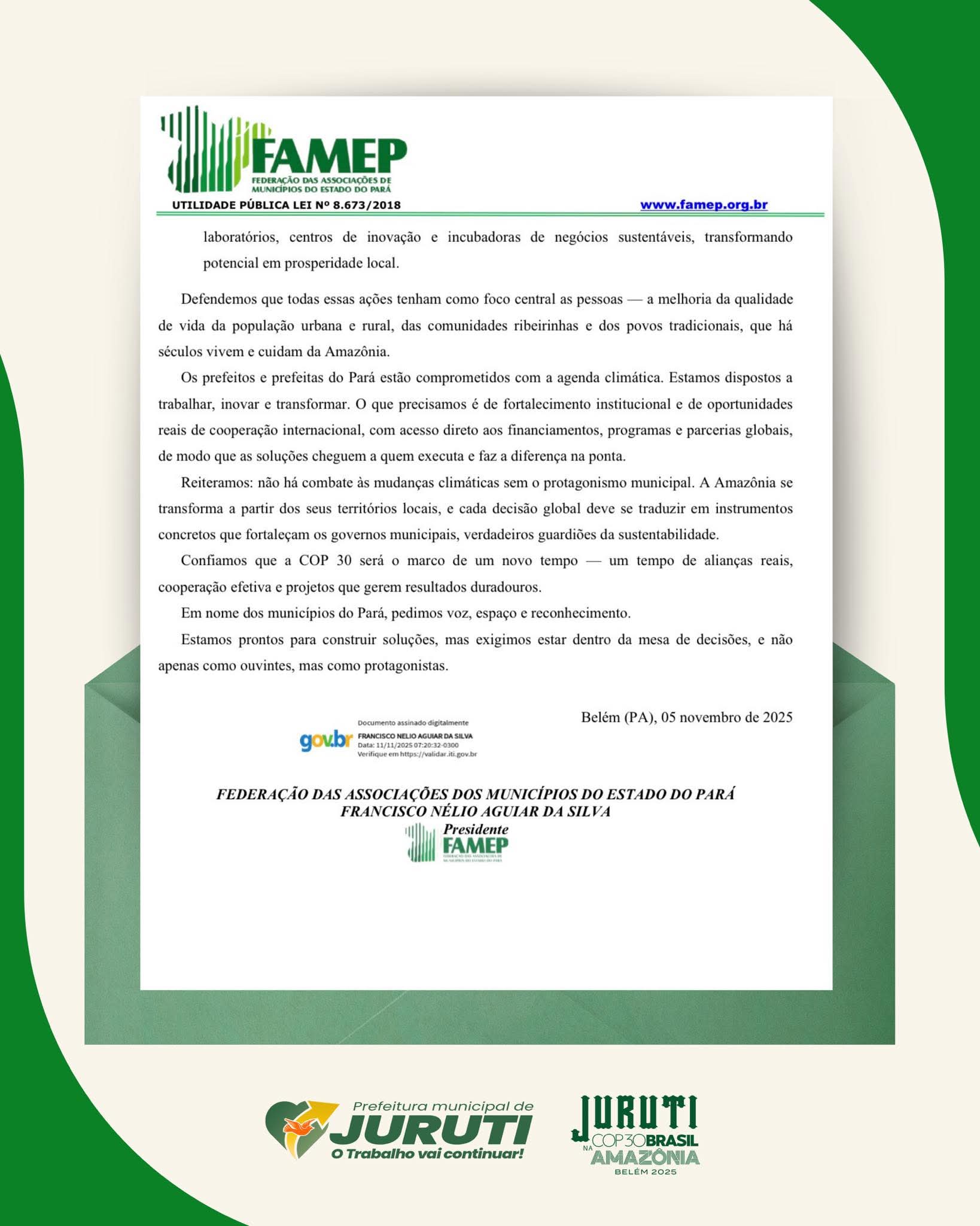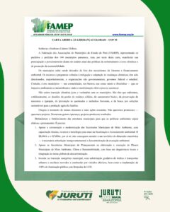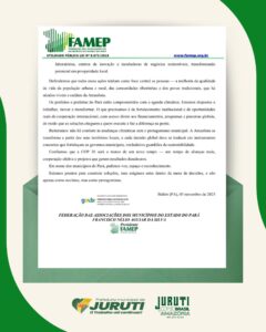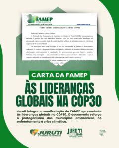 Dentro dessas articulações, Juruti integra oficialmente a manifestação apresentada pela Federação das Associações dos Municípios do Estado do Pará (FAMEP), documento direcionado às lideranças globais reunidas em Belém do Pará durante a conferência.