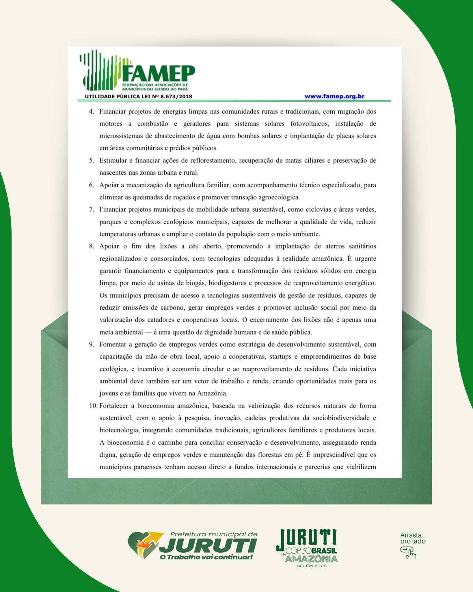 A manifestação da FAMEP destaca pontos essenciais, como o fortalecimento das estruturas municipais de meio ambiente, o acesso direto a financiamentos internacionais, a transição energética, a gestão sustentável dos resíduos, o incentivo à bioeconomia e o combate às mudanças climáticas com protagonismo municipal. O texto afirma ainda que não existe transição climática justa sem a participação ativa dos municípios amazônicos.